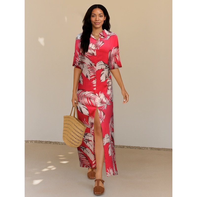 Tropical Maxi Shirt Dress RED – RED