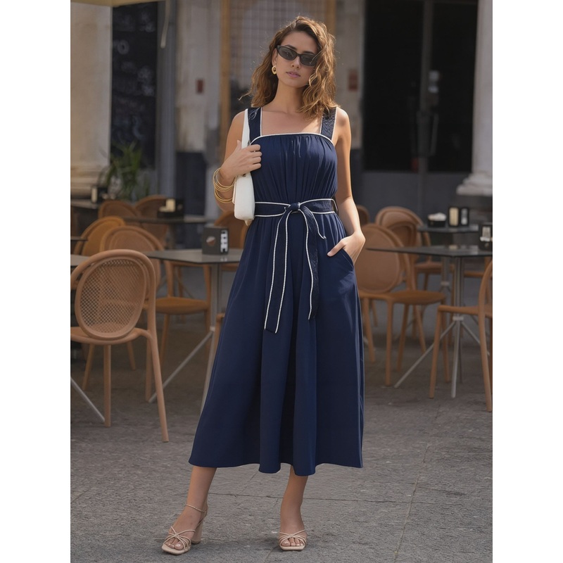 Bobble Trim Tie Midi Sun Dress BLUE – NAVY