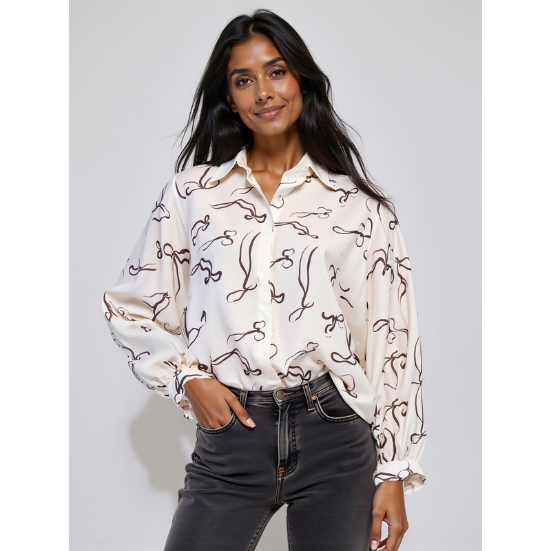 Bow Print Oversized Button Down Batwing Sleeve Shirt WHITE – WHITE
