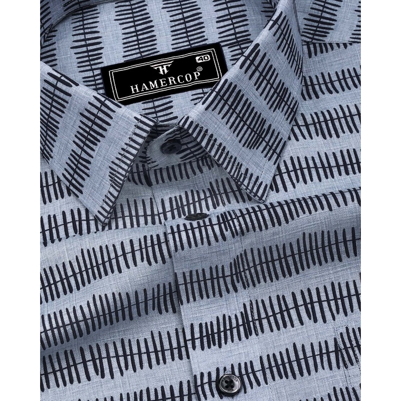 Astrick Gray With Black Printed Linen Cotton Shirt