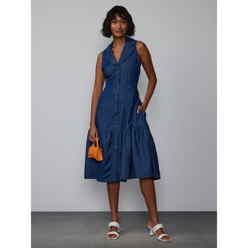 Sleeveless Chambray Collared Midi Dress BLUE – MEDIUM BLUE WASH
