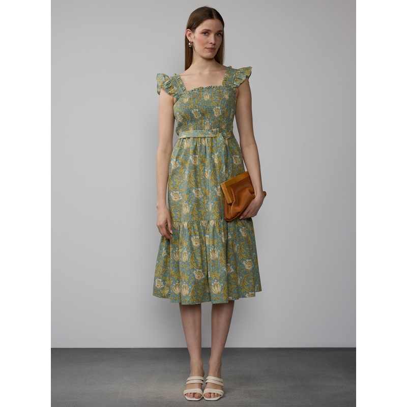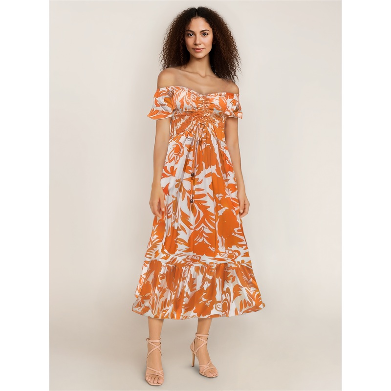 Smocked Top Printed Midi Sun Dress ORANGE – ORANGE