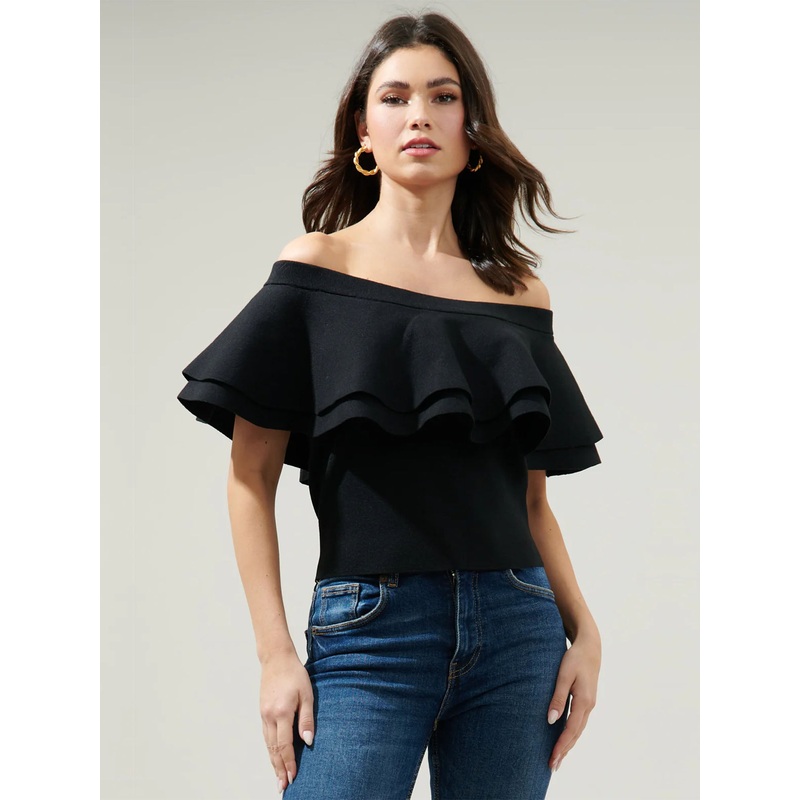 Sugarlips Off Shoulder Sweater Knit Flounce Top – Brands We Love BLACK – BLACK