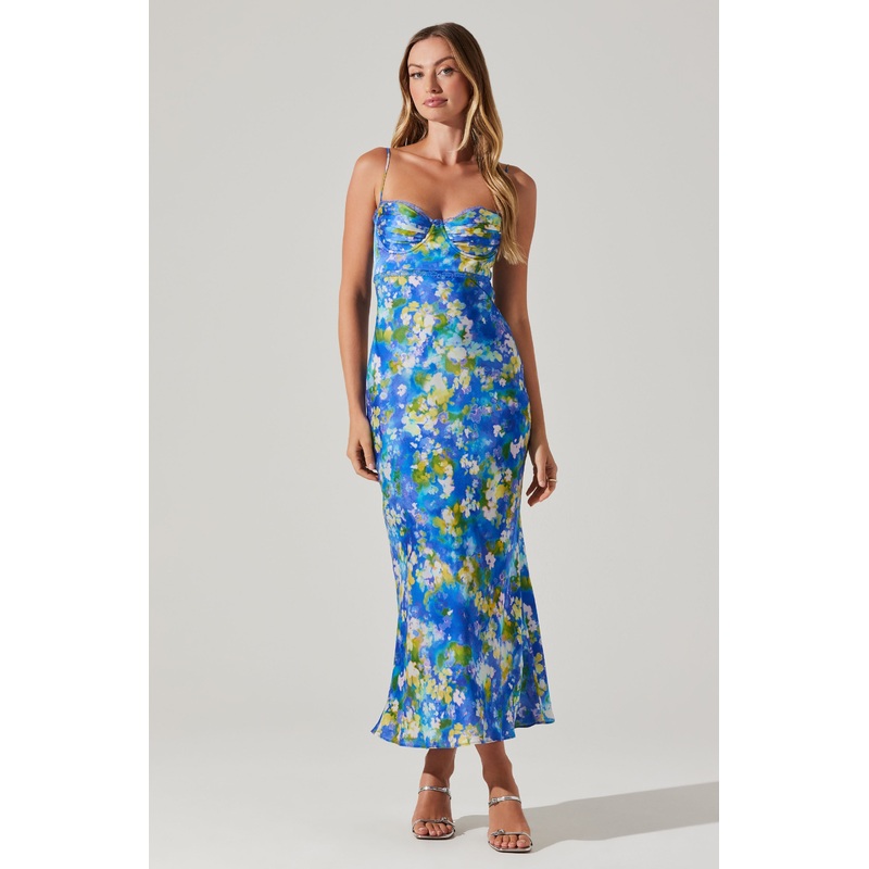 Florianne Floral Satin Maxi Dress Blue yellow abstract