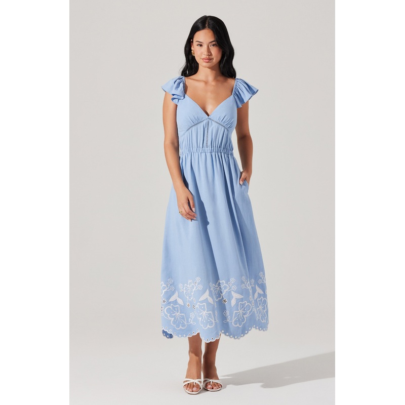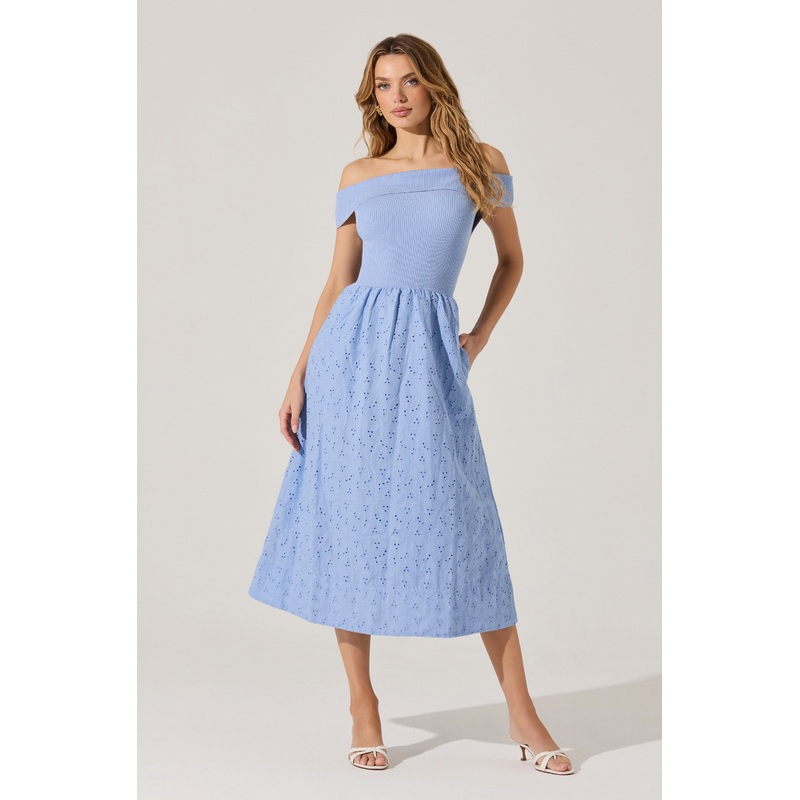 Off Shoulder Eyelet Midi Dress Blue