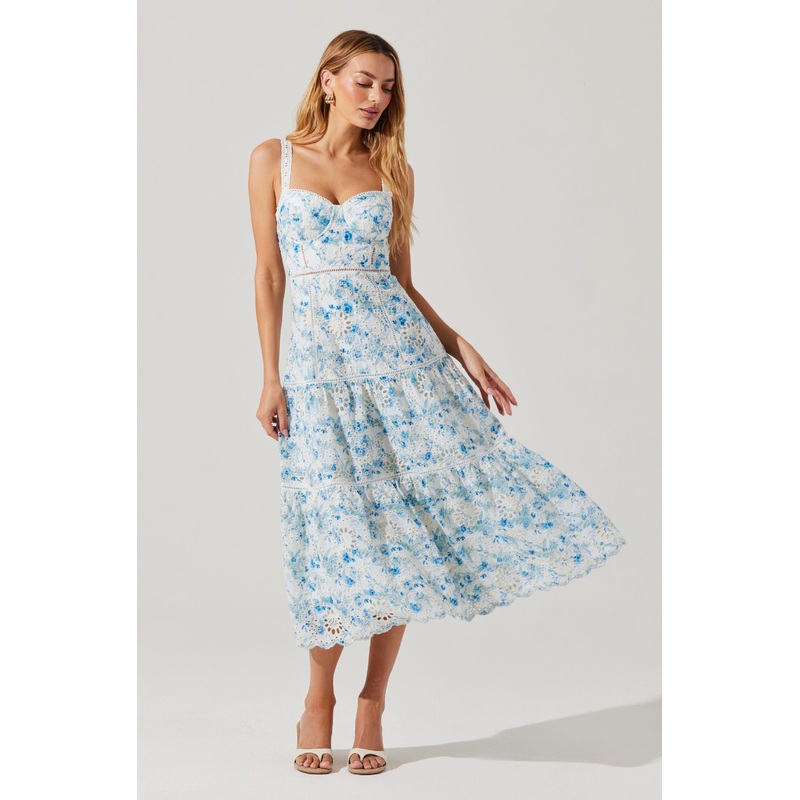 Pellagia Floral Eyelet Midi Dress White blue floral