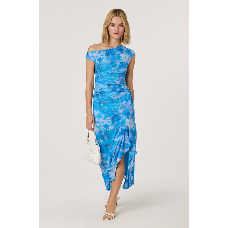 Off Shoulder Ruffle Midi Dress Blue watercolor