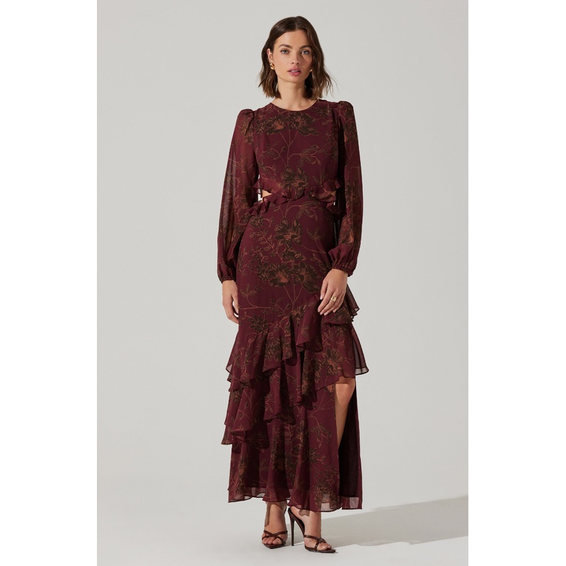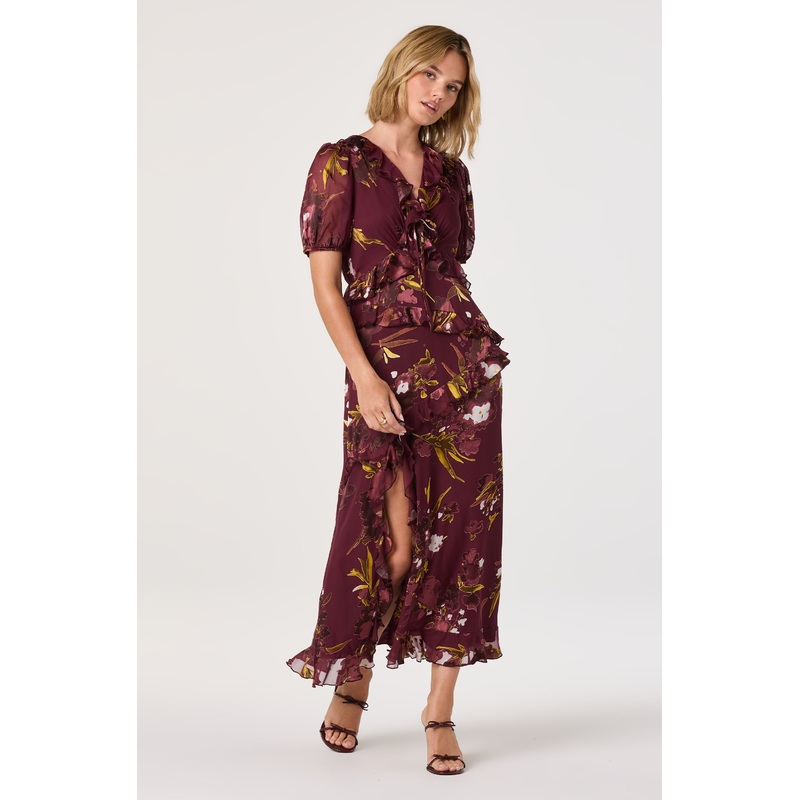 Biella Ruffle Floral Maxi Dress Plum brown floral