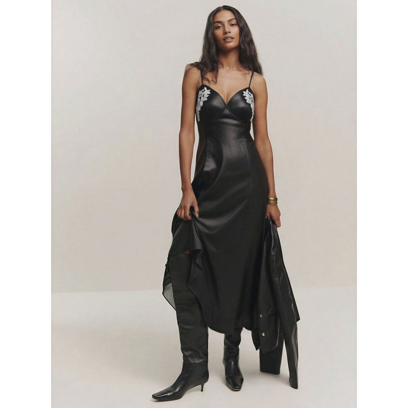 Vegan Leather Embroidery Detailed Maxi Dress BLACK – BLACK