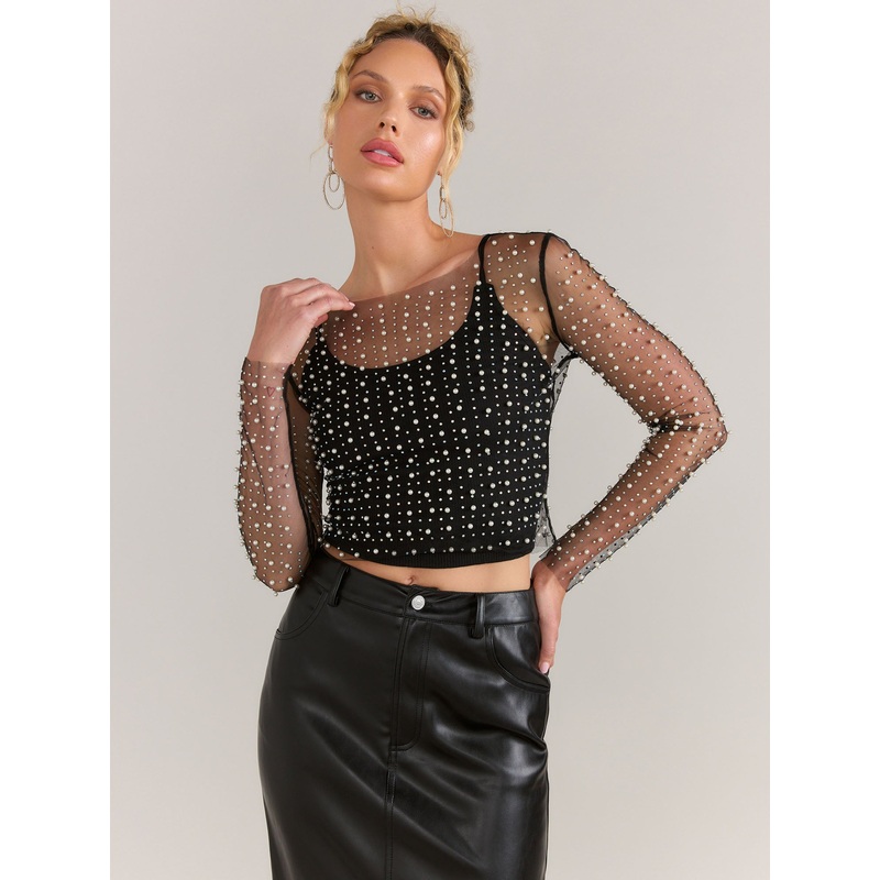 Vine Tree Rhinestone Pearl Embellished Mesh Crop Top – Brands We Love BLACK – BLACK