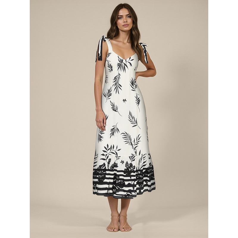 Black And White Border Leaf Tie Should Midi Dress NATURAL – CREAM