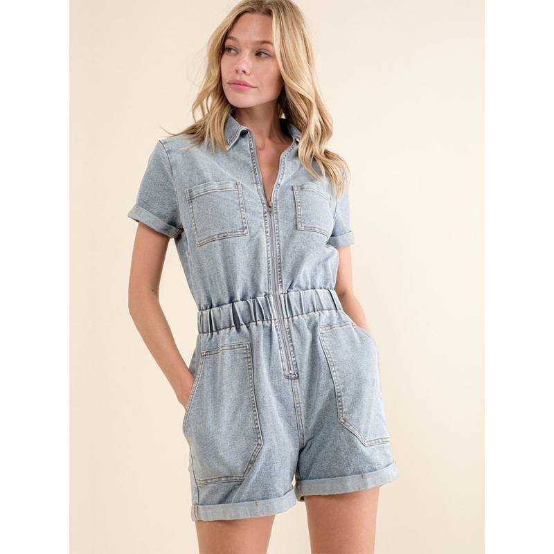 Blue B Short Sleeve Acid Washed Zip Front Denim Romper – Brands We Love DENIM – RINSE