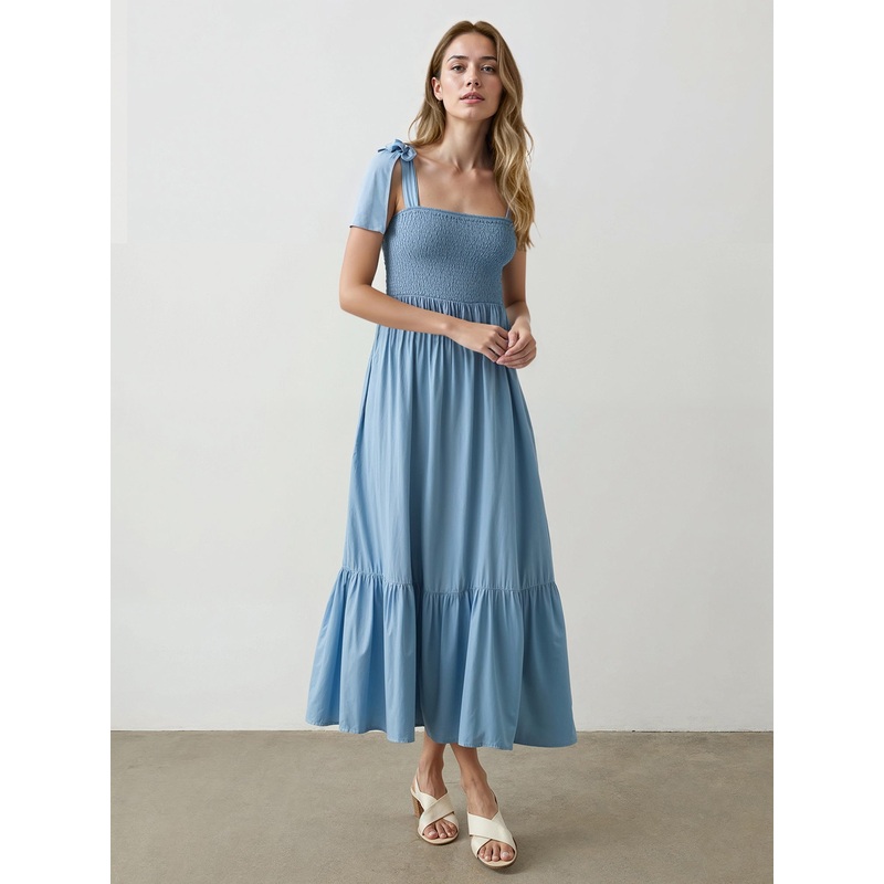 Tie Sleeve Chambray Midi Sun Dress BLUE – BLUE