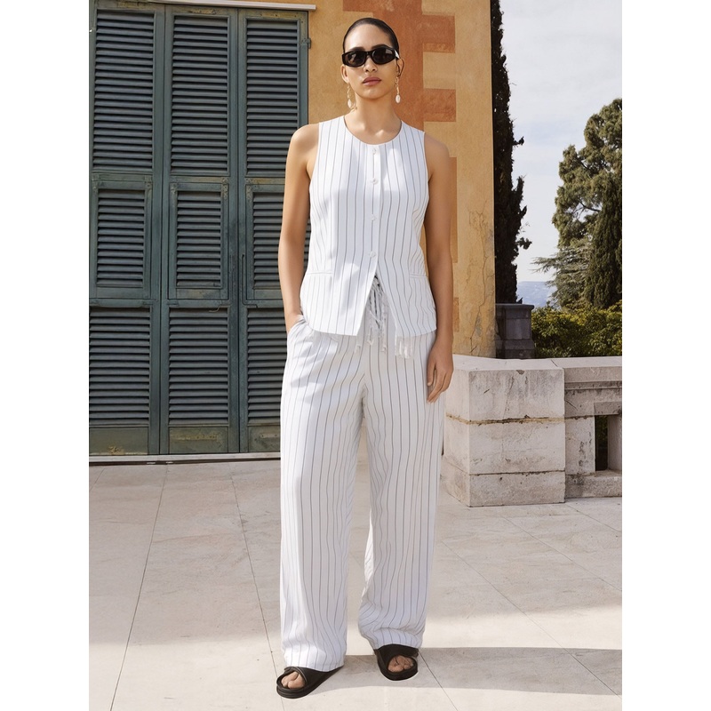 Tie Waist Pull On Stripe Flowy Pants WHITE – IVORY