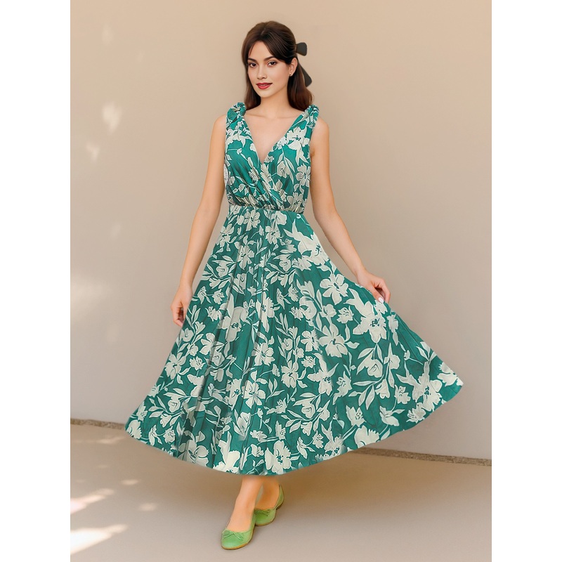 Tie Shoulder Floral Pleated Midi Dress GREEN – GREEN