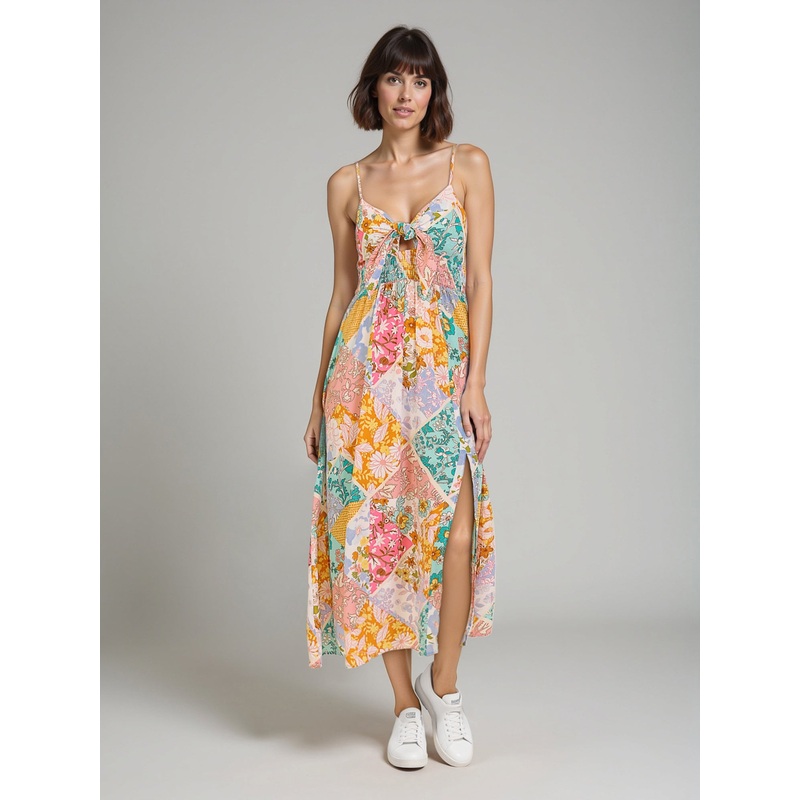 Tie Front Patchwork Floral Midi Sun Dress PINK – PINK