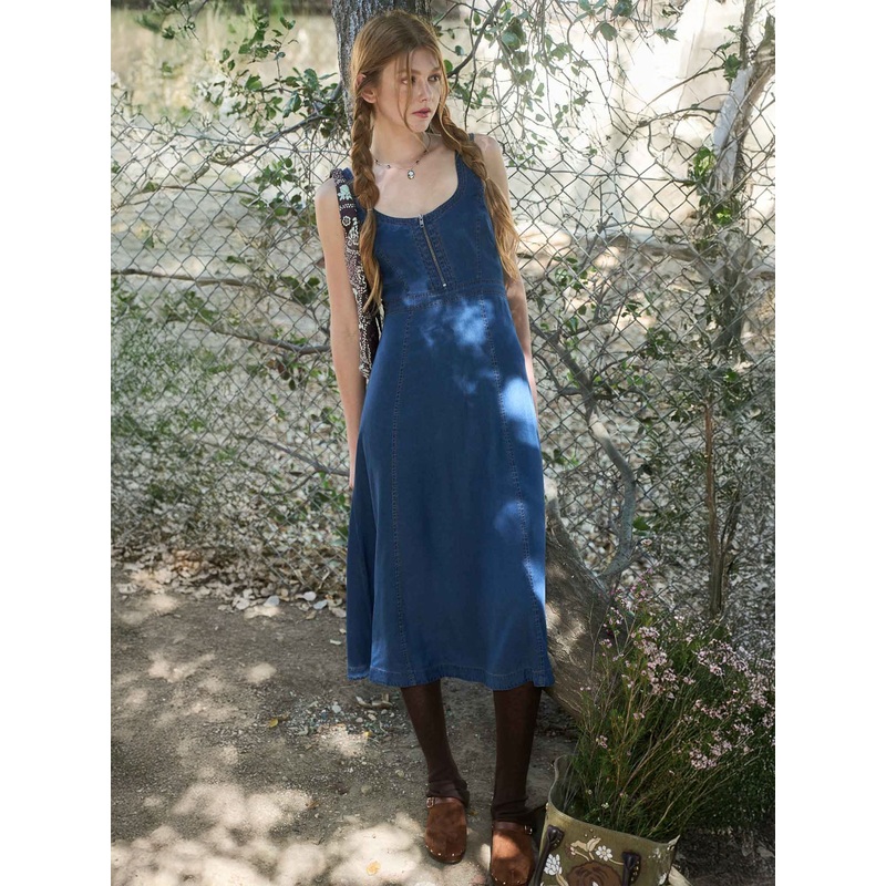 Zip Front Denim Midi Sleeveless A-Line Midi Dress BLUE – BLUE