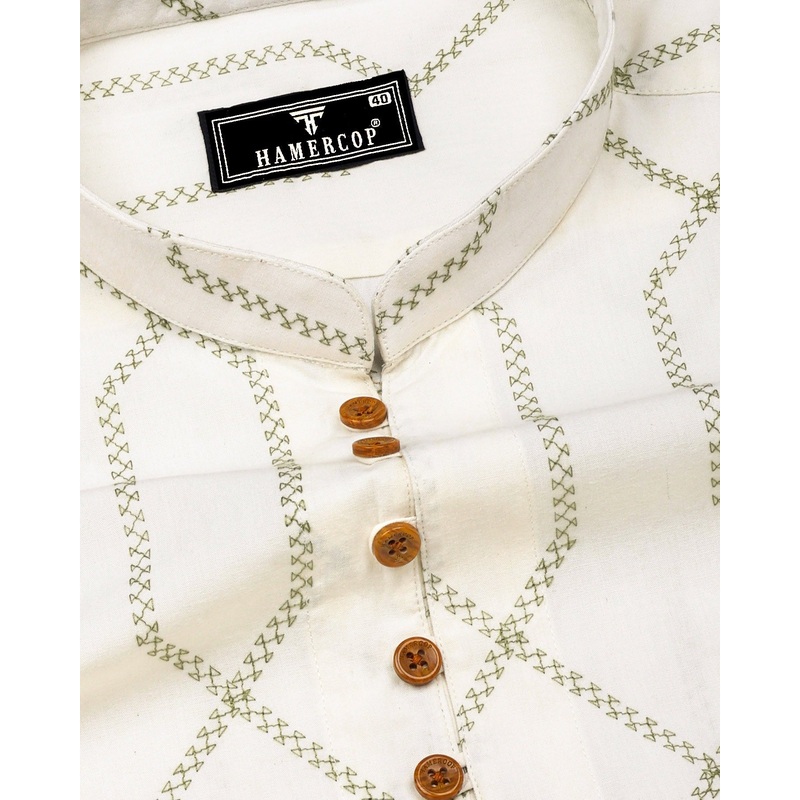 Zinzibar Ivory Cream With Green Thread Art Cotton Shirt Style Kurta