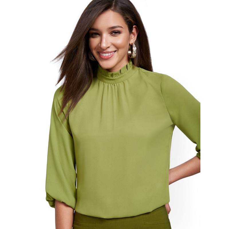 3/4-Sleeve Ruffle Mock-Neck Top GREEN – SHELTERING GREEN