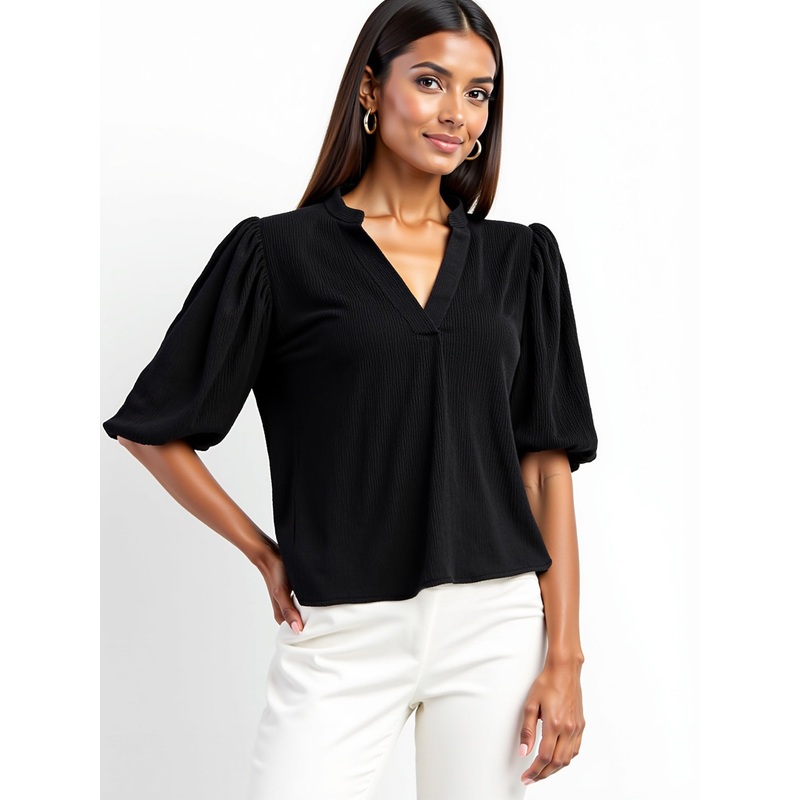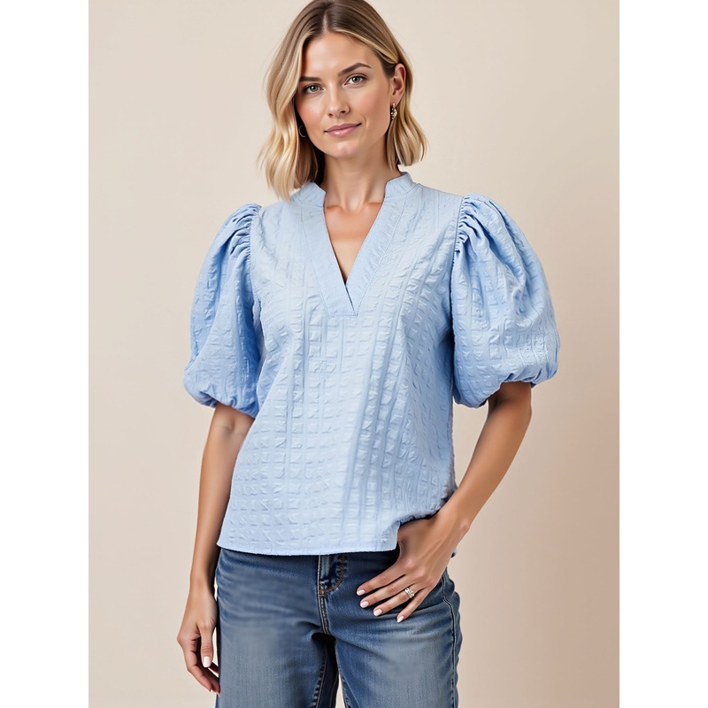 V Neck Puff Sleeve Blouse BLUE – BLUE