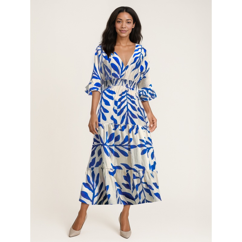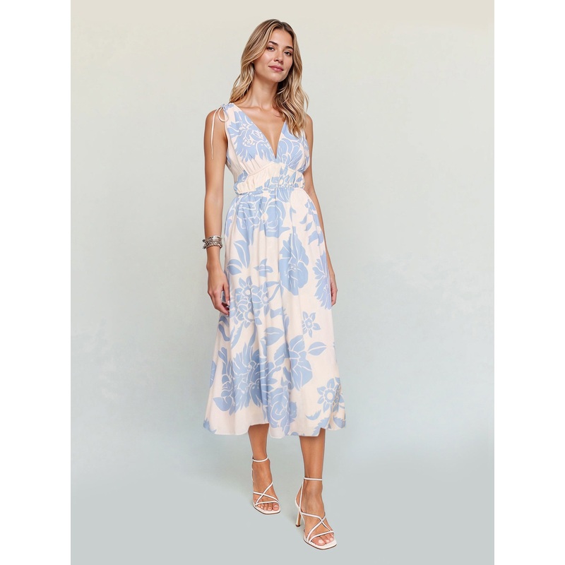 V Neck Shirred Waist Floral Fit Flare Midi Sun Dress BLUE – LIGHT BLUE