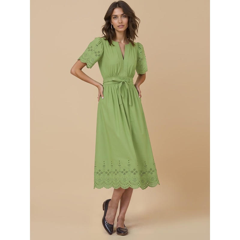 V-Neck Eyelet Sleeves Midi Dress With Bottom Tier Eyelet GREEN – GREEN
