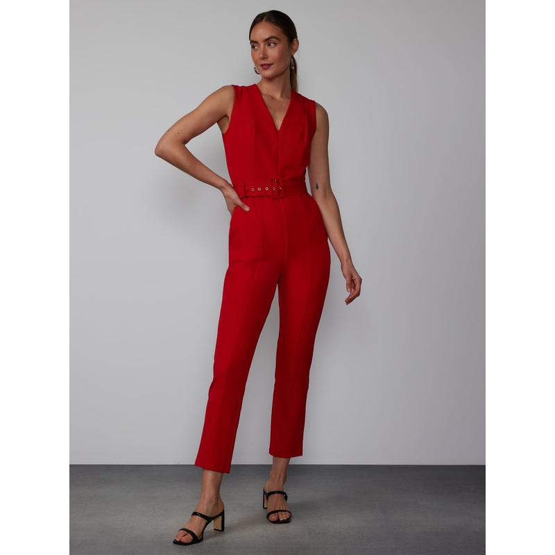 V-Neck Belted Seamed Jumpsuit RED – RED