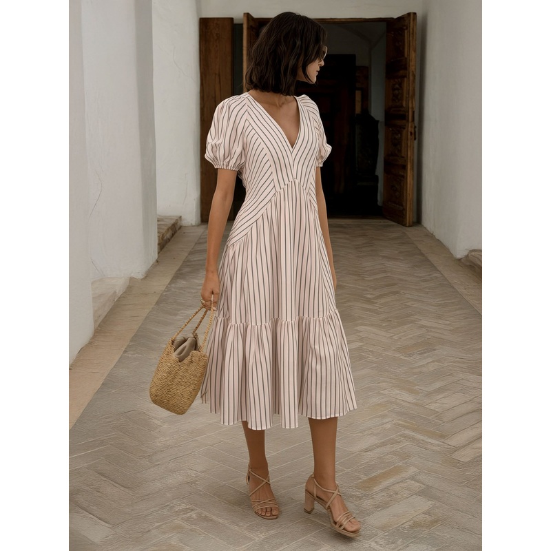Striped Puff Sleeve Tiered Midi Sun Dress PINK – PINK