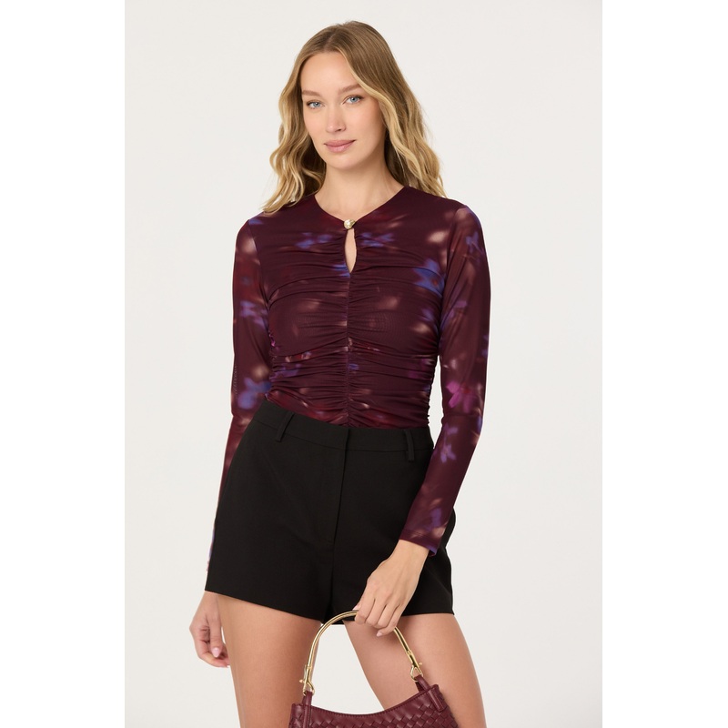 Yasmine Floral Mesh Ruched Top Dark plum multi
