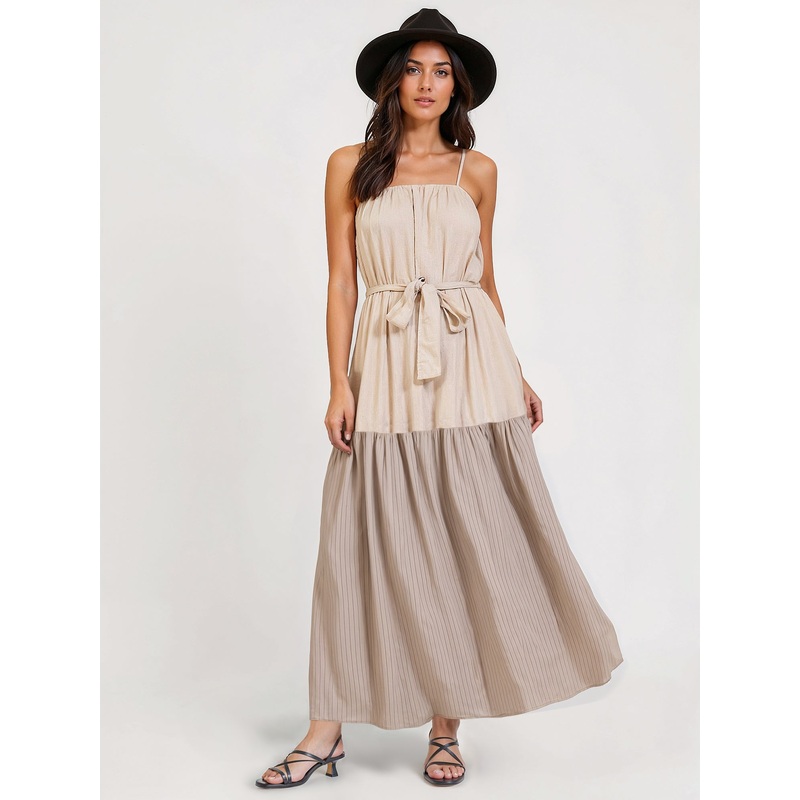 Two Tone Tie Waist Maxi Dress BROWN – TAN