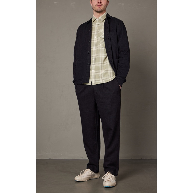 The Easy Pant features an elastic drawstring waistband and single front pleats. The fit is inspired by 3sixteens CS cut – roomy top block with a straight leg – and is cut with a short inseam and longer rise. The pants are finished with reinforced rear patch pockets for added durability. This season we developed a heavyweight cotton/linen blend fabric that drapes and breathes beautifully.
