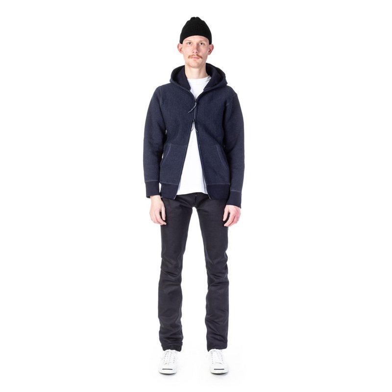 New color – Indigo fleece: 3sixteen’s Heavyweight Hoody has been updated with several improvements. The new one features heavyweight 500g/sm fleece, a slimmer fit and an rawhide leather zip pull. The hood is still thick but the drawstring has been eliminated for a cleaner look.