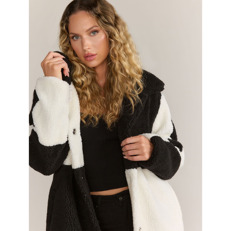 Snuggle in the comfort of this sherpa trench coat that features a collared neck and long sleeves. It has a chic colorblock design with convenient snap buttons down the front.