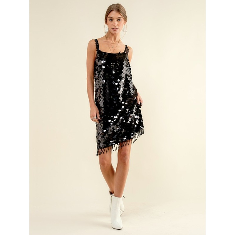 The extra large sequins make this dress stand apart from the crowd. From its relaxed silhouette to the fringe detail at the hem, it brings the 60’s charm back to life.