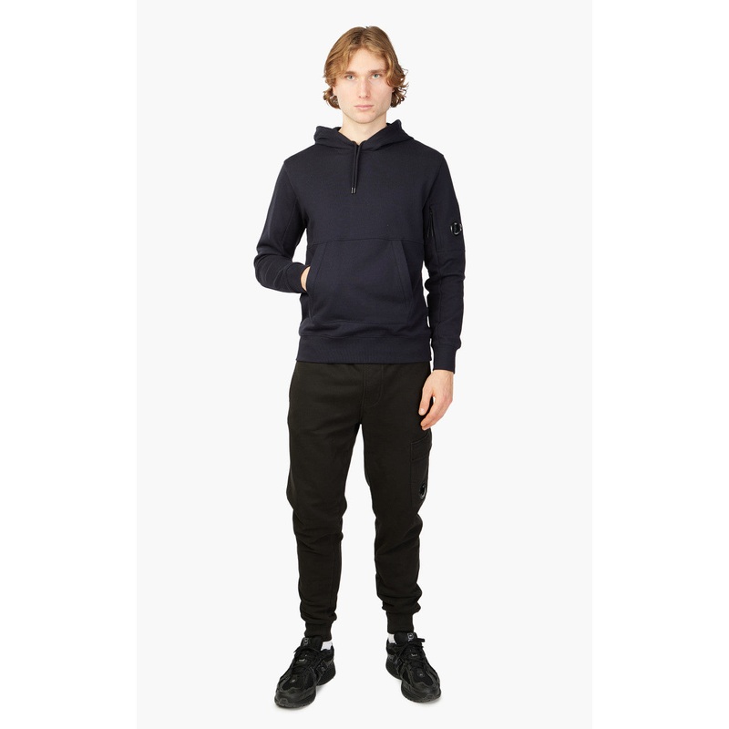Hoodie featuring kangaroo pockets, adjustable drawstring hood with logo and the C.P. Company Lens detail. Manufactured in diagonal raised fleece, a midweight loopback cotton option that combines absolute comfort with a substantial and hard-wearing feel.