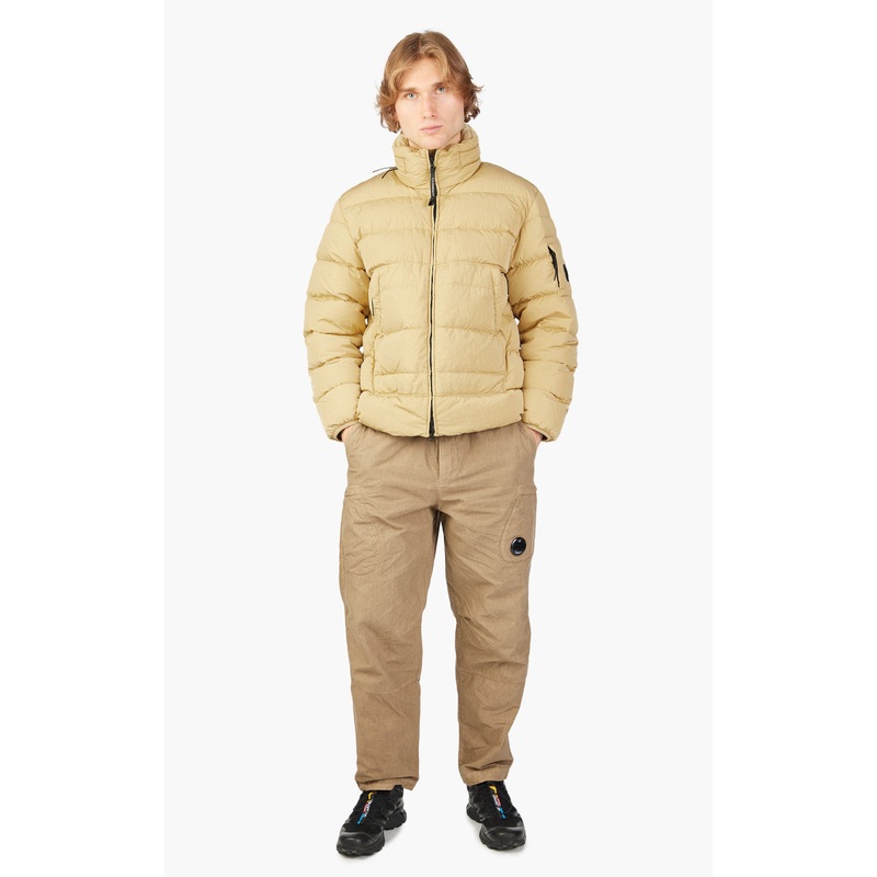 Medium down jacket with a concealable hood, full zip fastening and kangaroo pockets. The jacket also features an adjustable hem and the Lens detail. Chrome is C.P. Companys foundation woven multifilament nylon. This new version uses Econyl regenerated nylon yarns, created through the upcycling of fishing nets. Garment dyed for an increased chromatic depth and intensity throughout.