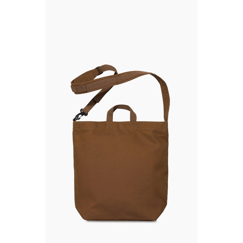The Dawn Tote Bag is constructed from 12 oz cotton Dearborn Canvas, featuring a wax coating for a water-repellent finish. It has a main compartment and front flap pocket, which both fasten with a snap closure. Inside, the item is fully lined and features an internal zipped pocket. The bag’s shoulder strap is both adjustable and removable.
