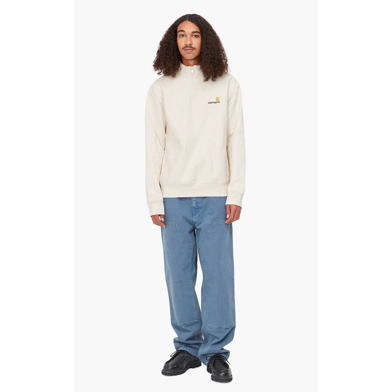 The Half Zip American Script Sweatshirt is constructed from a 12.3 oz cotton-polyester blend and brushed for extra softness and warmth, without losing breathability. The garment features a highneck with a zipper and a small logo. Appears in a loose, boxy silhouette.
