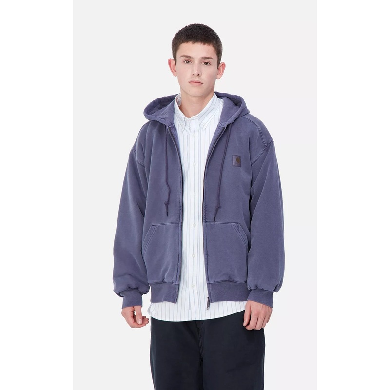 The Hooded Vista Jacket is constructed from heavyweight brushed cotton jersey. The garment has been pigment dyed for a deeper, more textured coloration. This item is based on our classic Active Jacket, and features a diamond quilted lining on the body, sleeves, and hood. The garment also has a kangaroo pocket. Executed in a ‘balloon fit’, which is a little looser and boxier, but also characterized by dropped shoulders and ribbed cuffs.