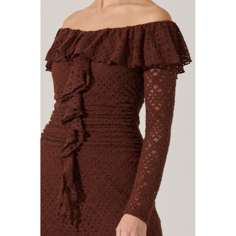 Be the first to review “Dorian Ruffle Off Shoulder Dress Brown”