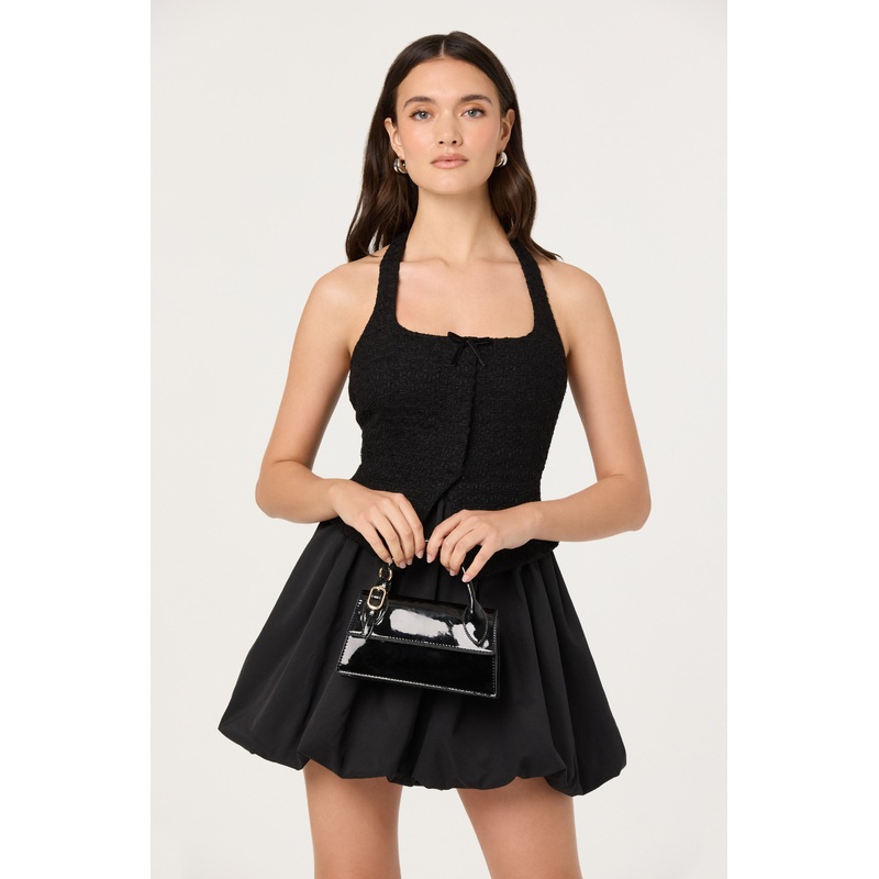 Fun meets sophistication in this mixed media mini dressperfect for parties, nights out, and elevated celebrations.
