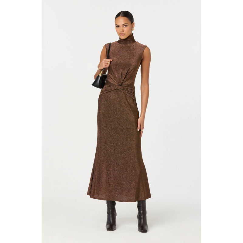 With a delicate twist front detail and metallic shine, this maxi dress was made for celebrations and evening plans.
