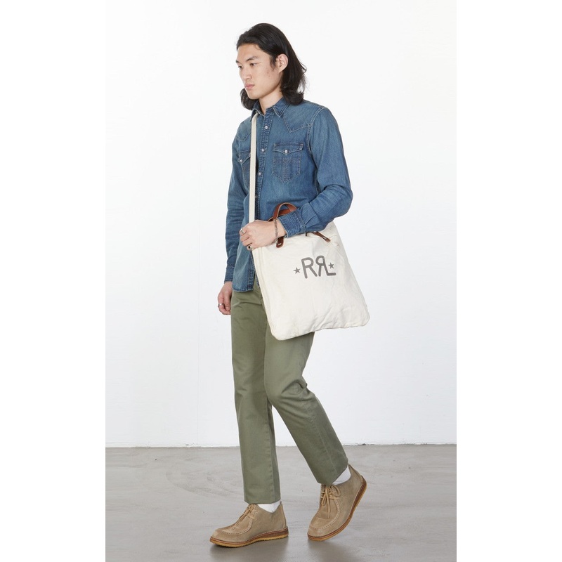 Cut from natural cotton canvas. Full-grain leather top handles. “RRL” logo and stars screen-printed on the front. Unlined.