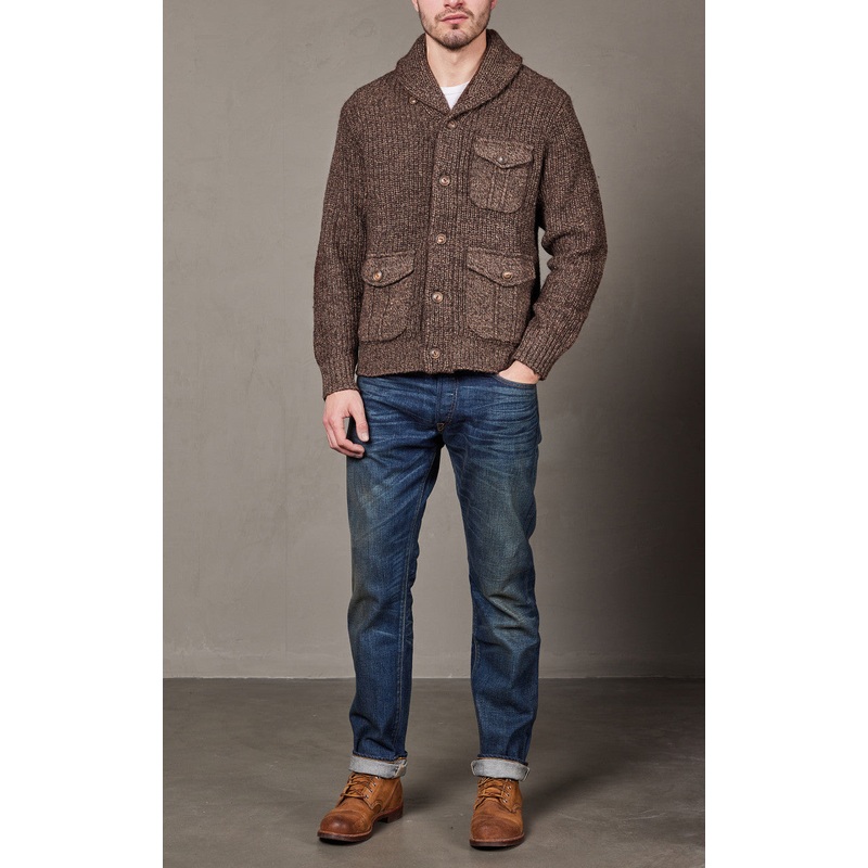 Vintage-inspired cardigan knit from marled yarn that is spun with wool, cotton, and linen. Suede elbow patches. Genuine horn buttons.