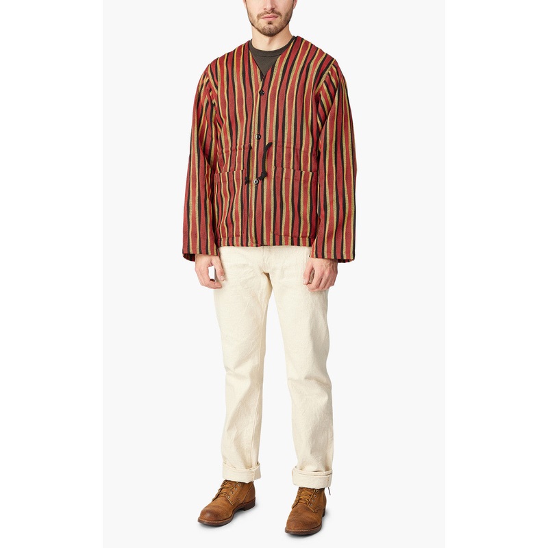 A liner jacket made of a heavy flannel fabric with wavy, staggering drunken stripes. The stripes are woven by a master weaver in the Banshu region of Japan whose business has been running for over 100 years.