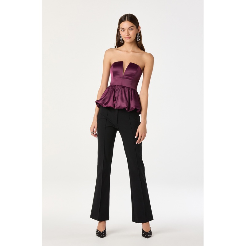- Satin strapless plunge peplum top