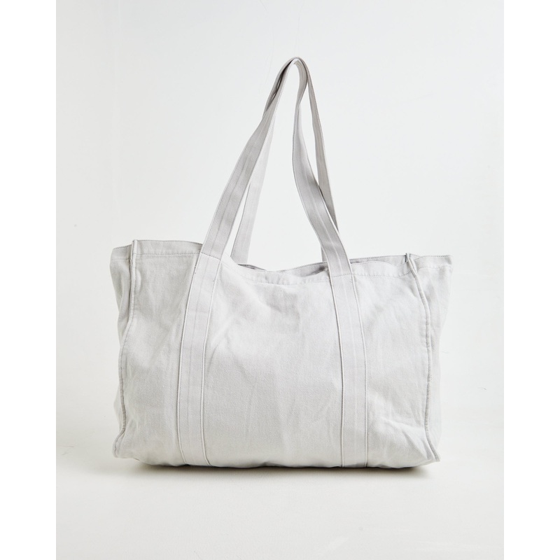 The Stonewashed Tote Bag by Subtitled comes in a grey colourway. The bag is designed with a spacious main compartment, two straps, magnet closure, front and interior pockets and signature branding at the centre front.
