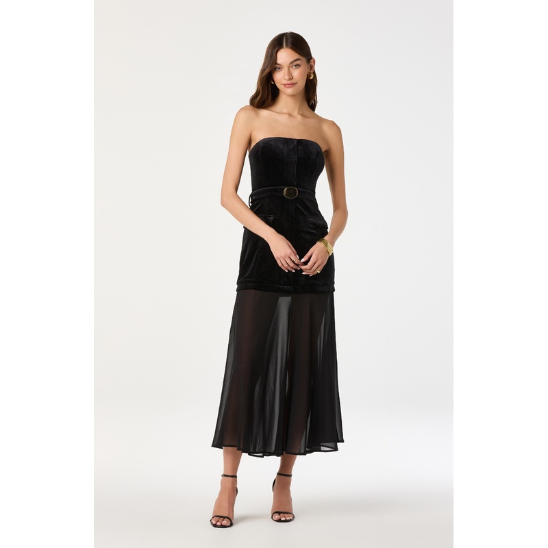 - Strapless contrast velvet belted dress