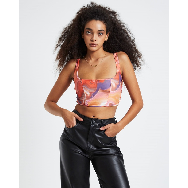 The Tampa Strappy Corset by Love Notes is a slim fitting style that comes in an assorted dye pattern. The corset features a square neckline and tie details along the sides. Style it back with leather pants and heels for a fun date night fit.