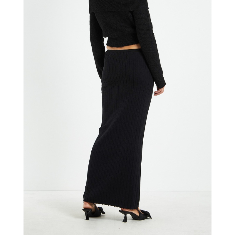 The Tayla Texture Knit Midi Skirt by Subtitled comes in a black colourway and is crafted in a textured rib knit fabrication. The skirt is designed with a midi length, low rise and elasticated waistband. Style it back with a knit jumper and heels for a night out with the girls.